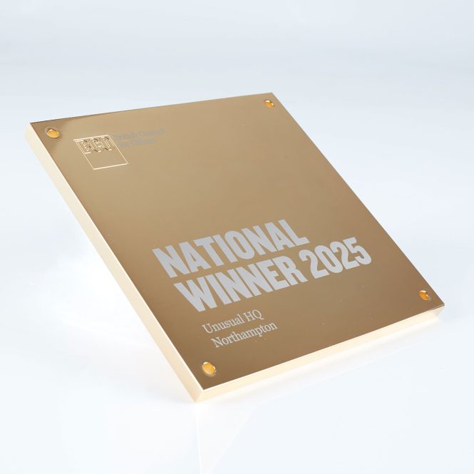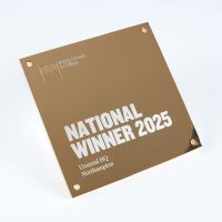 The BCO Plaque is crafted from polished gold-plated aluminium, delivering a sleek, mirror-like finish that enhances its clean, contemporary form. A precision-machined logo adds subtle dimensional detail, while laser-engraved winner information provides a crisp, refined finish that reflects the prestige of the award.
