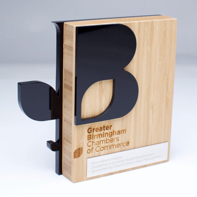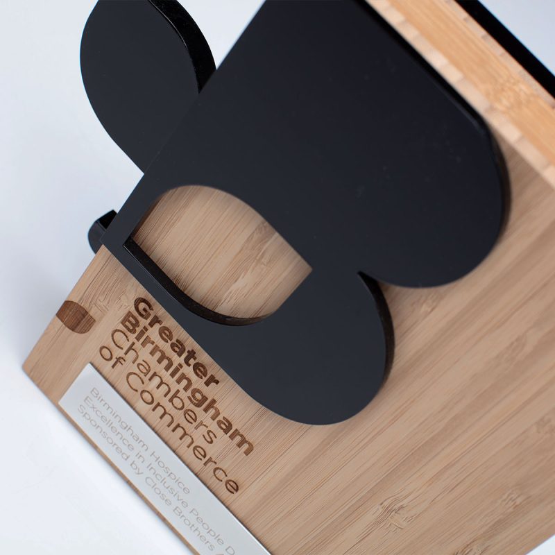 The Greater Birmingham Chambers of Commerce Award combines recycled black acrylic with a natural bamboo core, creating a striking contrast between bold, modern form and warm, sustainable material. Finished with a polished metal plate and precision laser-engraved detailing, the design delivers a refined, contemporary aesthetic that reflects both innovation and heritage.