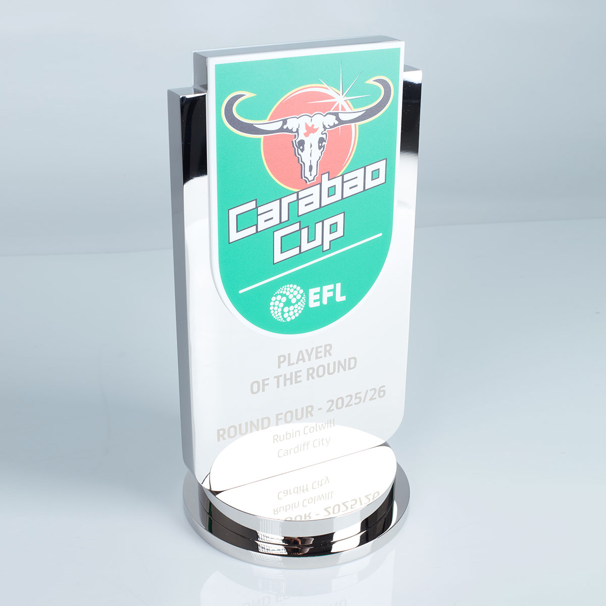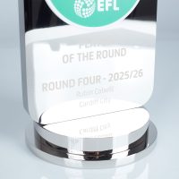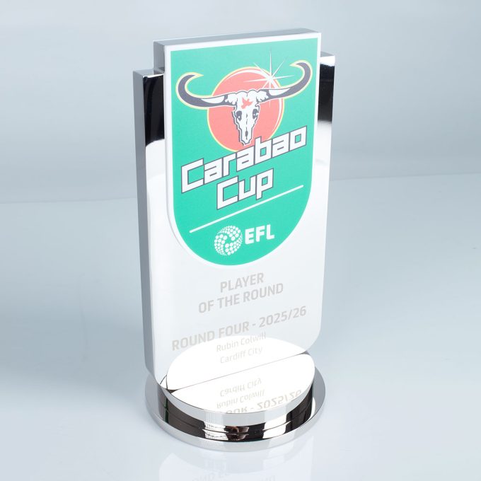 The Carabao Cup Player of the Round Award combines polished nickel-plated aluminium with layered white acrylic panels, creating a clean, high-contrast backdrop for the vibrant, digitally printed club crest. Finished with precision laser-engraved detailing on the metal face and set on a tiered, polished aluminium base, the piece delivers a sleek and contemporary trophy that reflects the prestige of the competition.