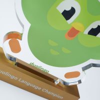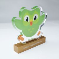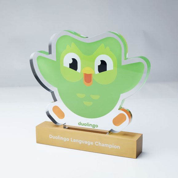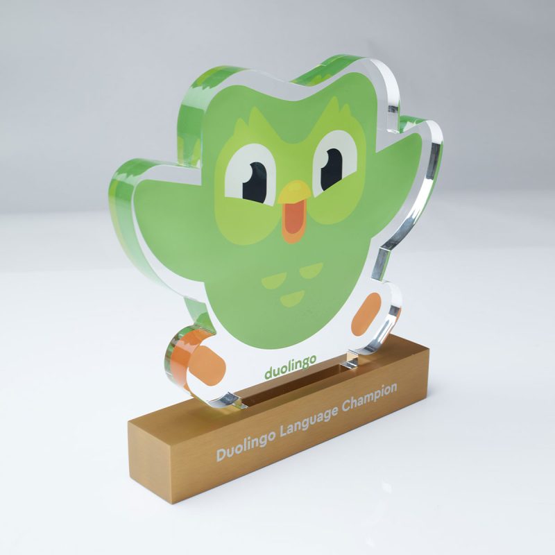The Duolingo Award combines a vibrant digitally printed clear recycled acrylic top with a brushed anodised aluminium base, creating a playful yet premium contrast between bold colour and refined metallic finish. Precision laser engraving to the base enhances the presentation, while the polished acrylic edges and layered construction bring the iconic Duolingo character to life with depth and clarity.
