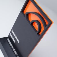 The Edinburgh Fellowship Award pairs a sleek black anodised aluminium body with a vibrant fluorescent lava orange acrylic core, creating a bold contrast that enhances its modern, graphic aesthetic. Finished with precision laser-engraved detailing, the piece delivers a sharp, contemporary look that reflects the creativity and prestige of the Edinburgh TV Festival.