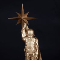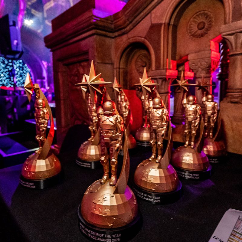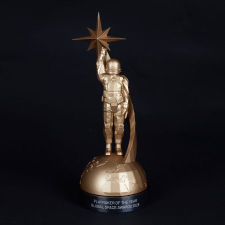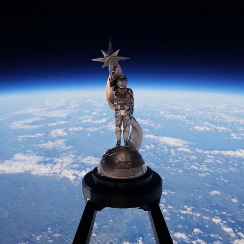 Our first award to go into space! This stunning award came to reality as a 3D printed model with a bright gold metallic finish & weighty black anodised aluminium engraved base.
