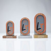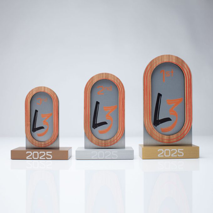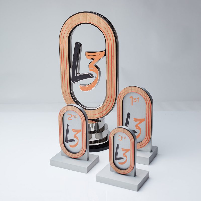 The tiered base also had a black acrylic layer. The two smaller award designs were made in anodised solid aluminium, bamboo and digitally printed.