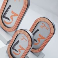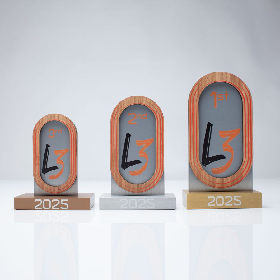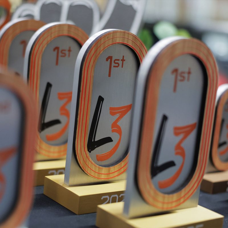 The design for the awards were based on the tournament’s venue, the famous Lee Valley VeloPark, a beacon of British cycling and a legacy of the London 2012 Olympics. EFX created three different sized awards for each race, in 1st, 2nd & 3rd place. The first place and largest design at 440mm was made from gold anodised aluminium with added bamboo track detailing and a digitally printed and waterjet cut L3 for the centre.