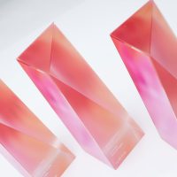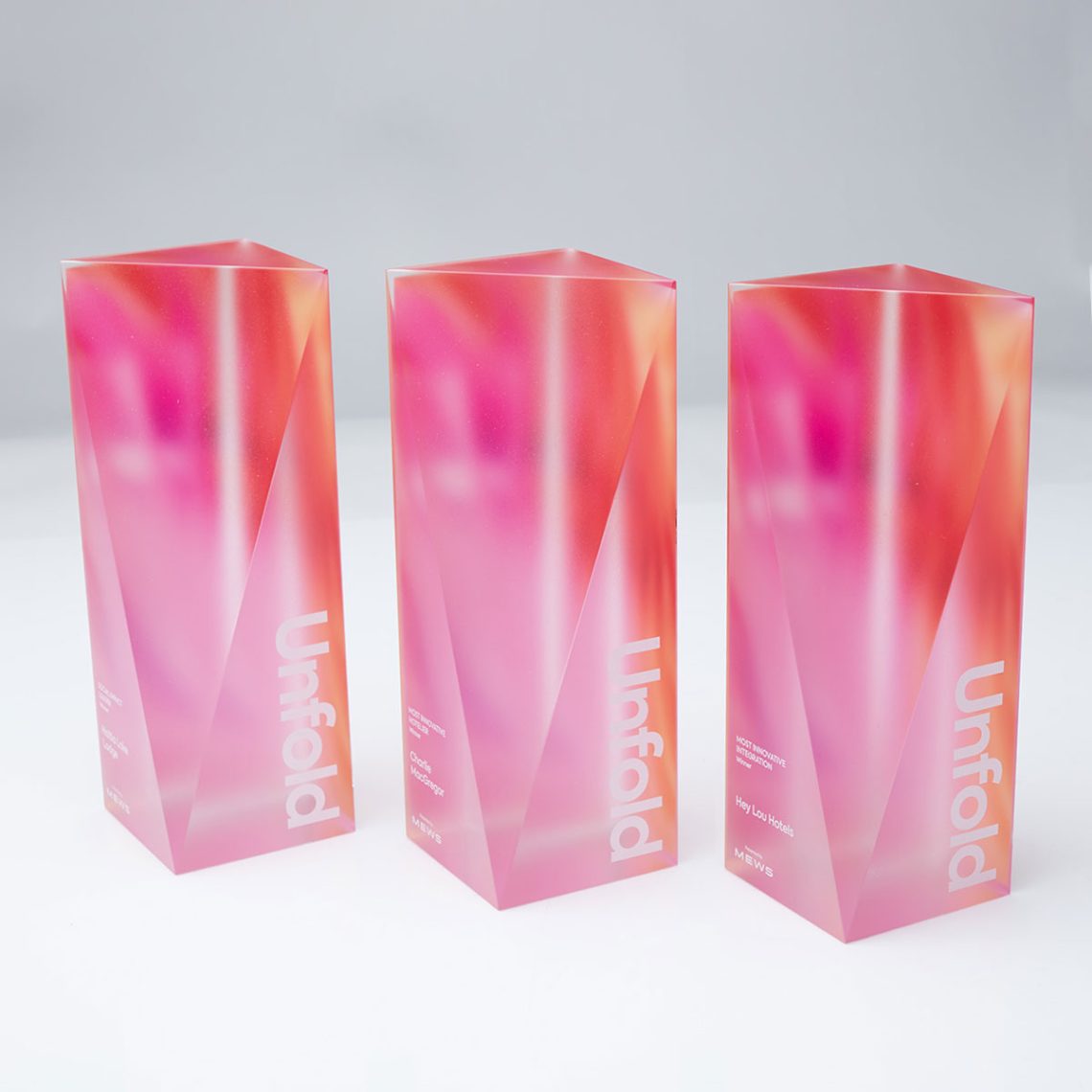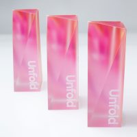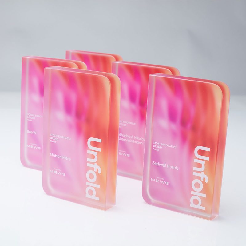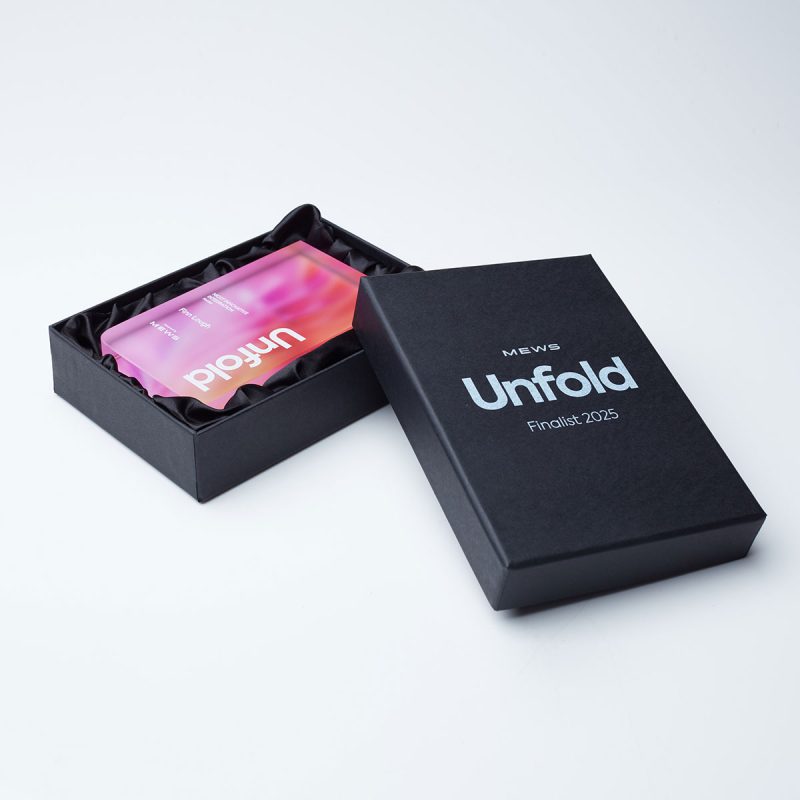 The Mews Unfold Award is crafted from premium clear crystal, enhanced with digitally printed colour detail applied to the reverse faces to create depth and a vibrant, layered visual effect, while the front surface features a refined frosted finish with crisp white text and logo detailing. Supplied in beautiful branded presentation boxes.