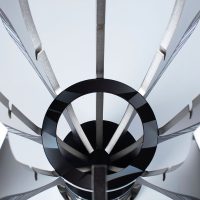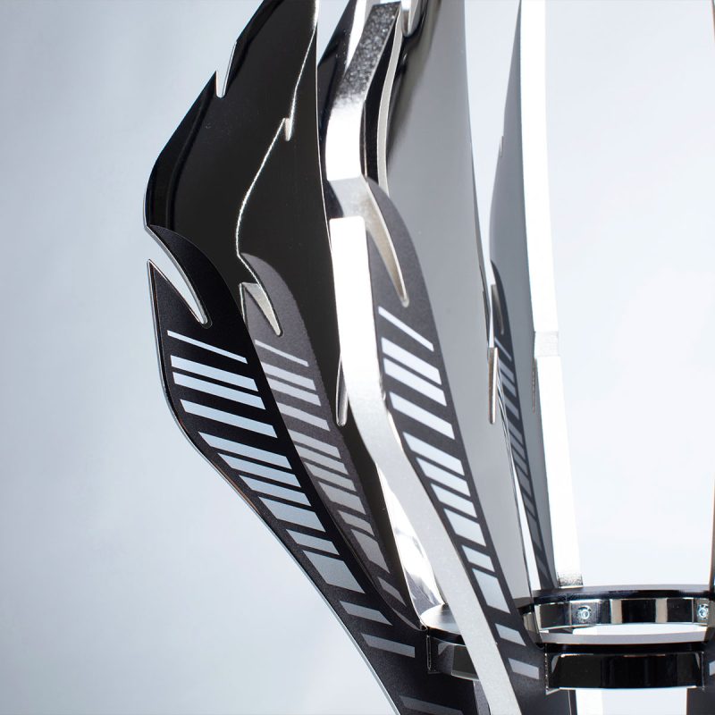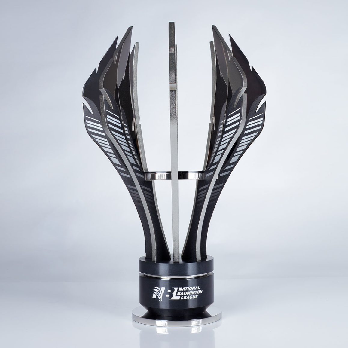 The National Badminton League trophy features a striking combination of polished nickel-plated aluminium, black anodised aluminium, and black acrylic, creating a bold contrast between reflective and dark finishes. Digitally printed detailing within the acrylic elements enhances the dynamic, feather-inspired form, while precision laser engraving to the base completes the piece with a sleek, contemporary finish that reflects the speed and energy of the sport.