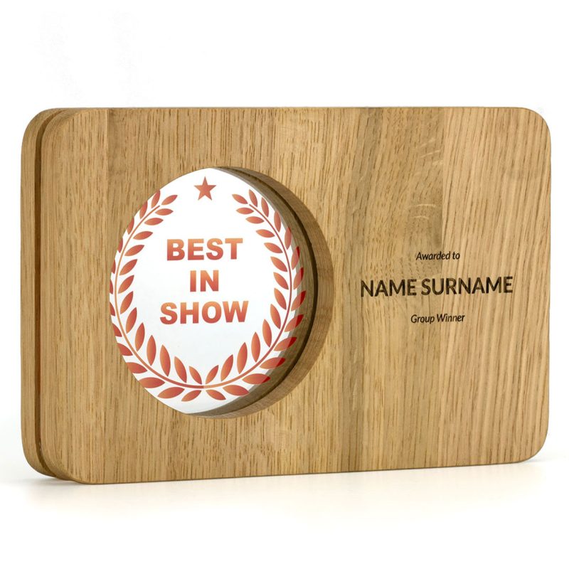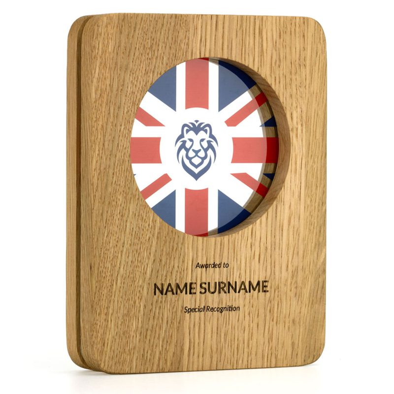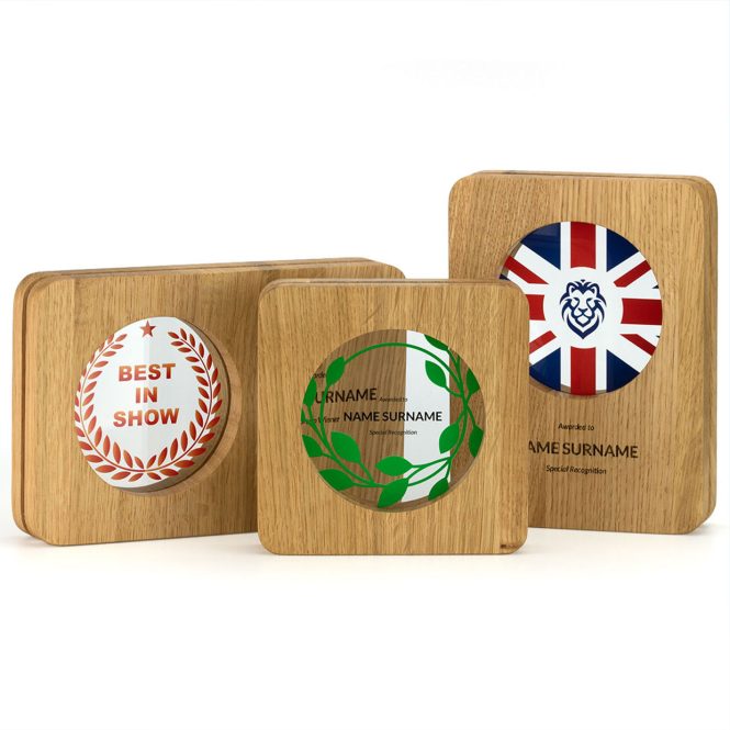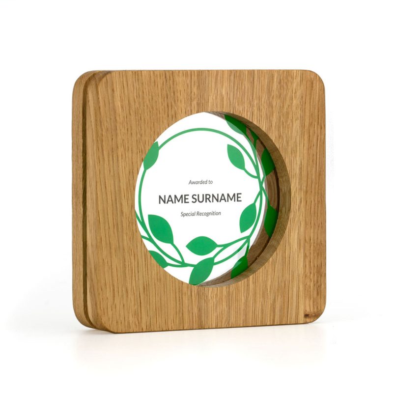 The Acrylic Window Awards are a fusion of solid oak and clear recycled acrylic, designed and manufactured entirely in the UK. Two layers of premium 12mm thick European oak frame a recessed ‘window’ of 5mm thick, 100% recycled acrylic.